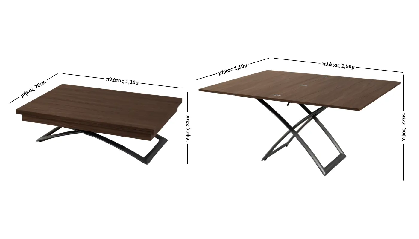Το πολυμορφικό τραπεζάκι σαλονιού Bessy, σχεδιασμένο να φέρει σύγχρονη αισθητική και απόλυτη λειτουργικότητα στο χώρο σας. Με το μοναδικό κυματοειδές σχήμα του σκελετού, ξεχωρίζει ως διακοσμητικό στοιχείο, ενώ ο μηχανισμός Advanced lift Pro επιτρέπει τη μετατροπή του από χαμηλό τραπεζάκι σαλονιού σε τραπέζι φαγητού διπλασιάζοντας το πλάτος του (από 75εκ. σε 150εκ.) σε λίγα δευτερόλεπτα.